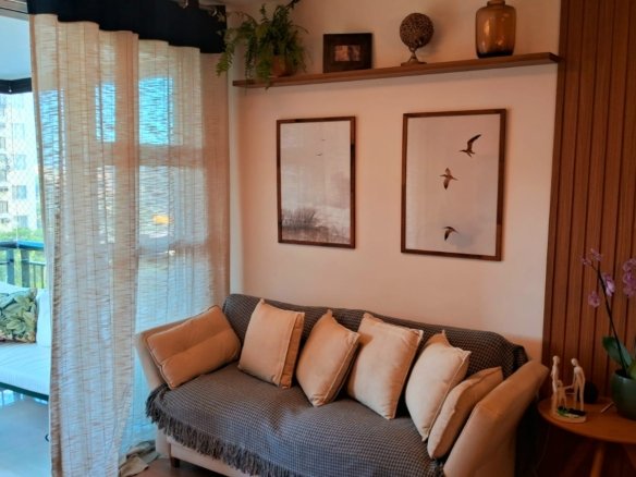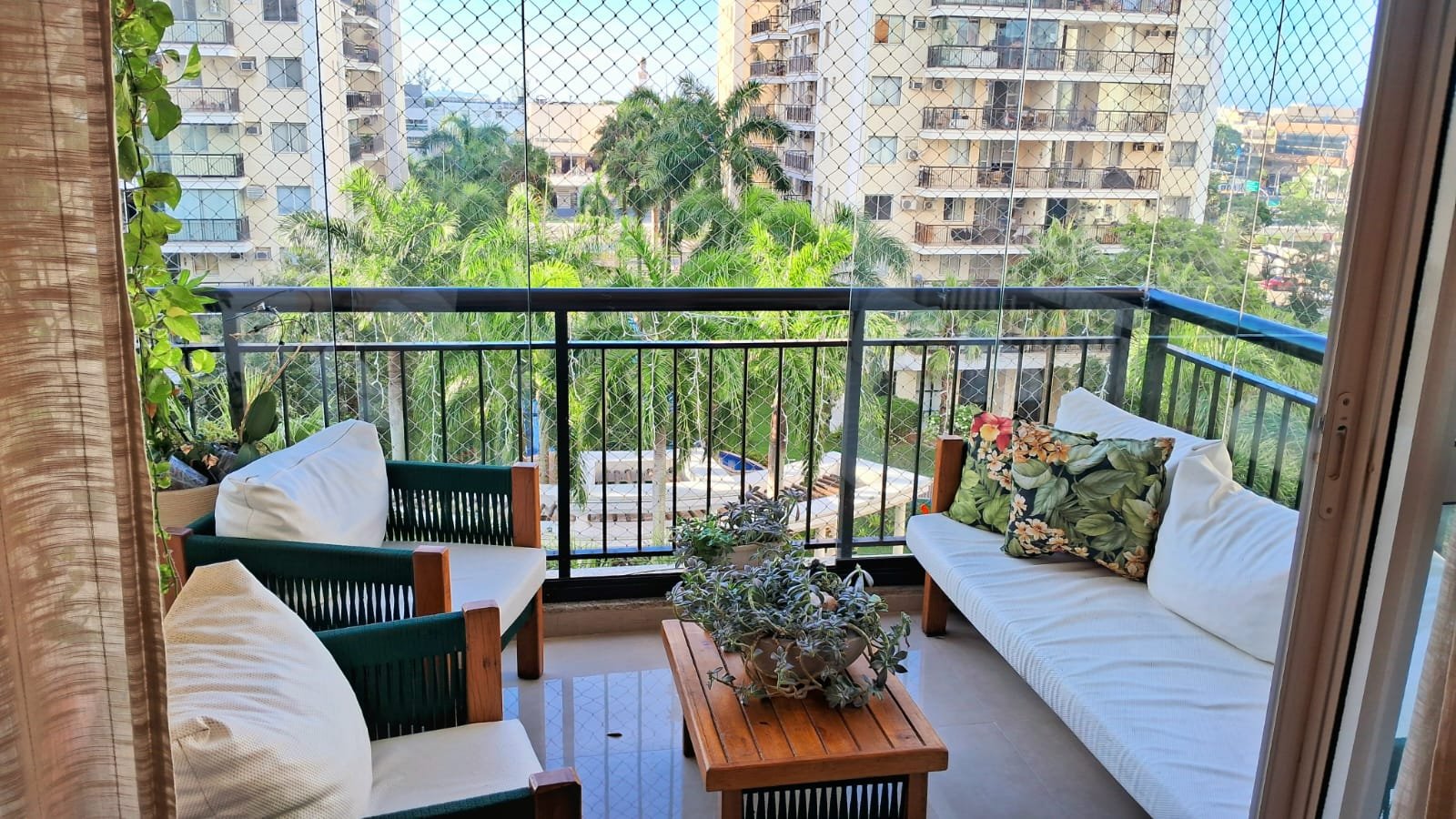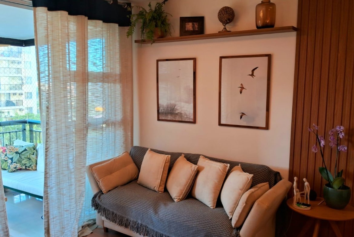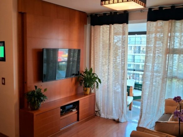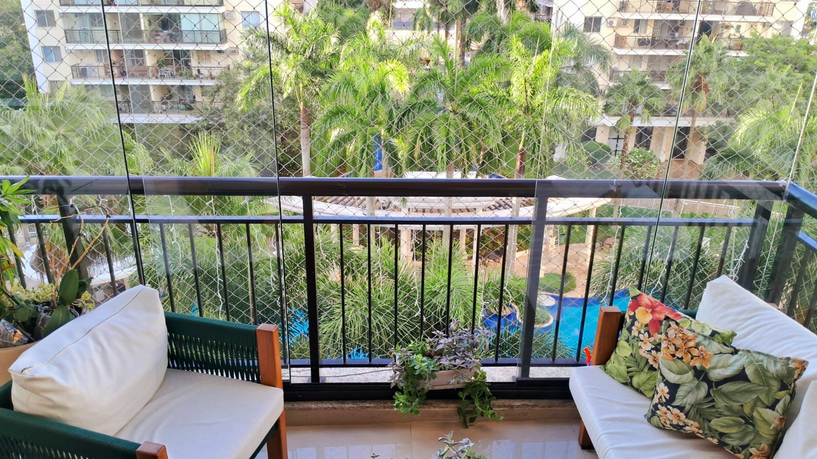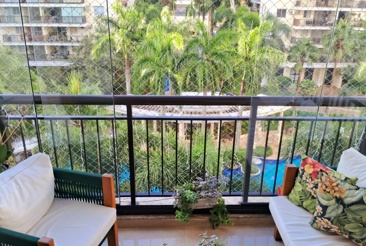 Imóvel: Varanda com cortina de vidro, linda vista para a área interna do condomínio, Piscina e vista para Av das Américas, 2 quartos, 01 suíte, com armários planejados, sala, cozinha e área de serviço com armarios planejados, circulação social, banheiro social e da suíte com box blindex, armários planejados e espelho, teto rebaixado com projeto de iluminação, finamente reformado, 68m2, 01 vaga, chave na mão.